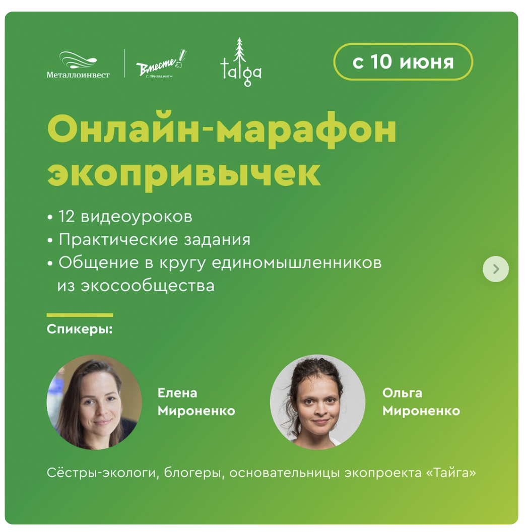 Уже два года подряд мы проводим для компании Металлоинвест трёхмесячный экомарафон, который помогает сотрудникам шаг за шагом переходить к более экологичному и осознанному образу жизни. Каждая неделя посвящена актуальным темам — от сокращения пластика и микропластика до экологичных привычек в быту, заботы о здоровье города и уменьшения пищевых отходов.